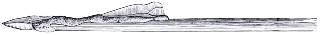 La hampe des flèches est équipée à son extrémité de petits silex tranchants de forme géométrique (triangles, trapèzes...) appelés microlithes. Ces armatures en pierre sont typiques du Mésolithique tant pour le tir en forêt que pour la pêche au harpon des nombreux poissons (perche, brochet, anguille…)